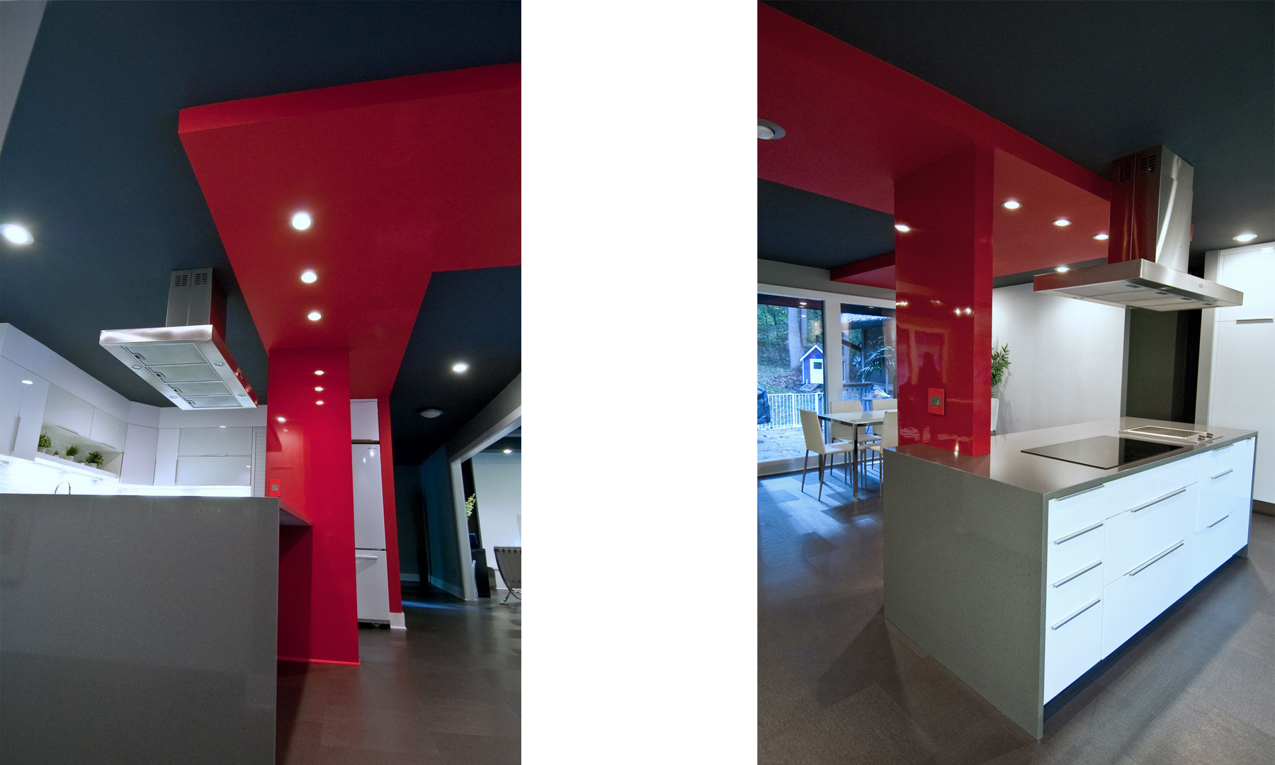 Midcentury Modern inspired custom kitchen with banquette and screen in walnut