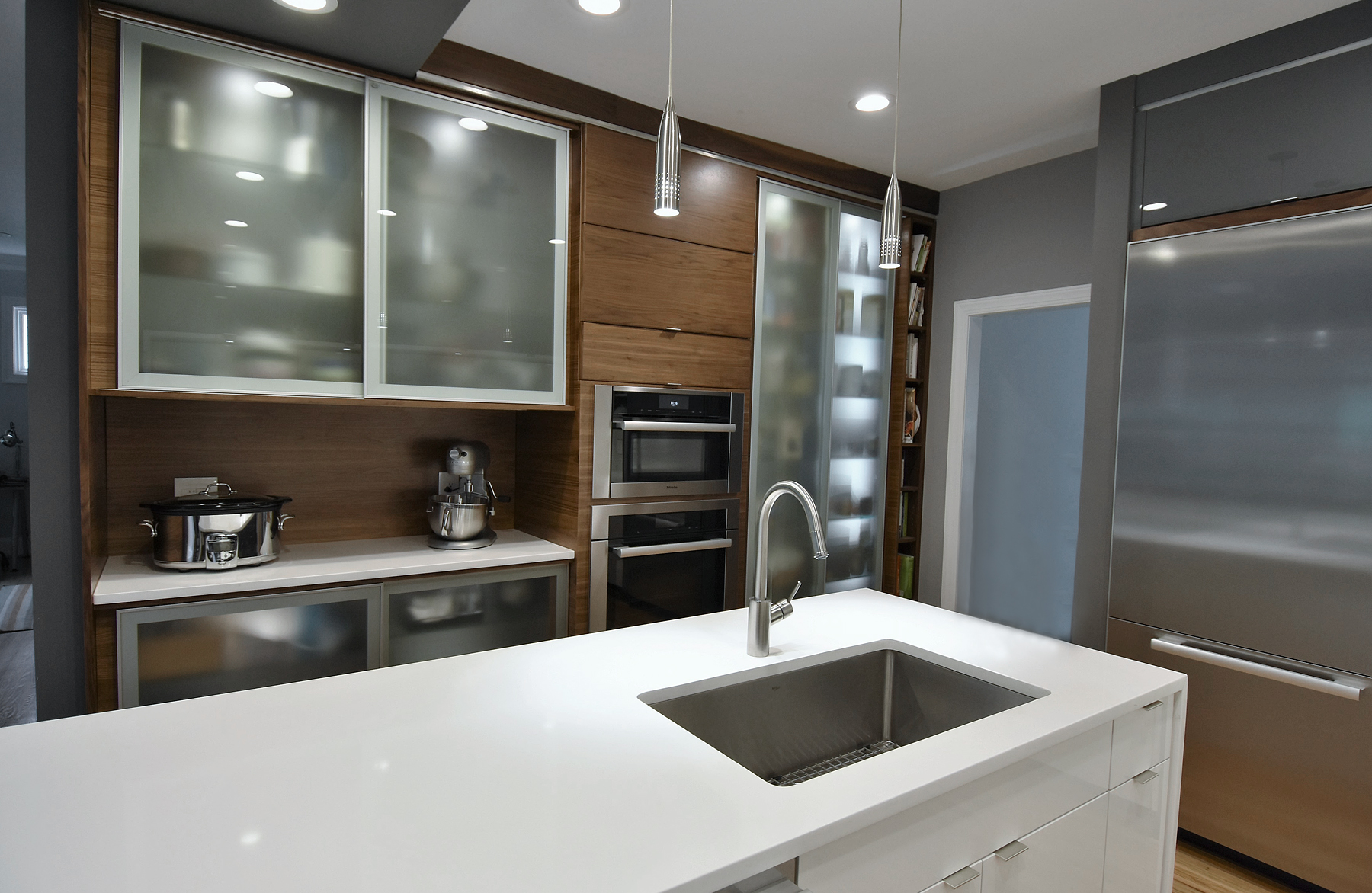Midcentury Modern inspired custom kitchen with banquette and screen in walnut