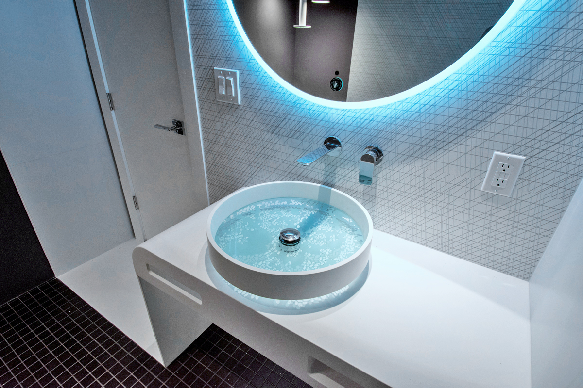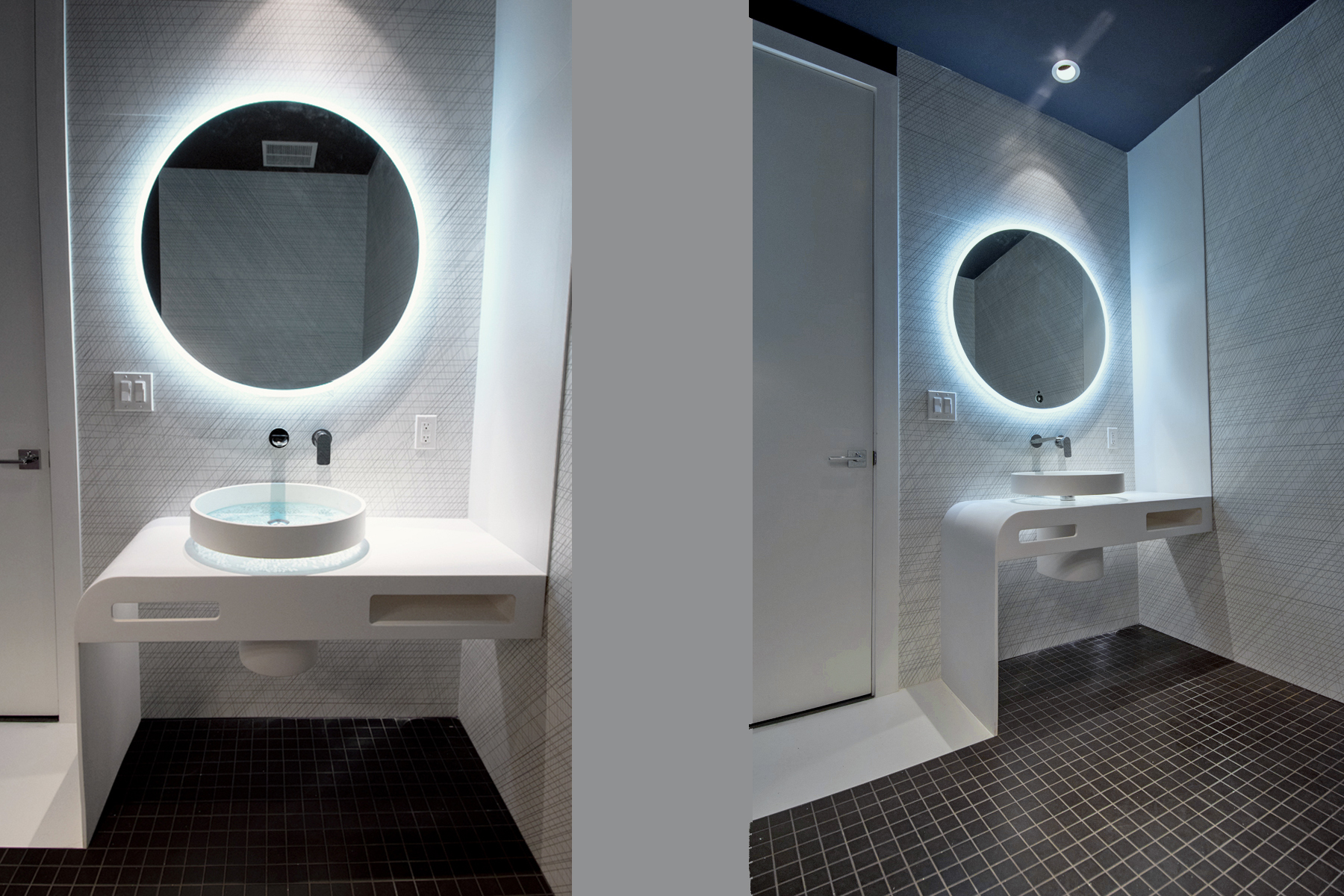 Custom Powder Room, Charlotte NCSmall custom designed powder room with bespoke vanity console in Corian solid surface with specialty Corian & etched glass sink.