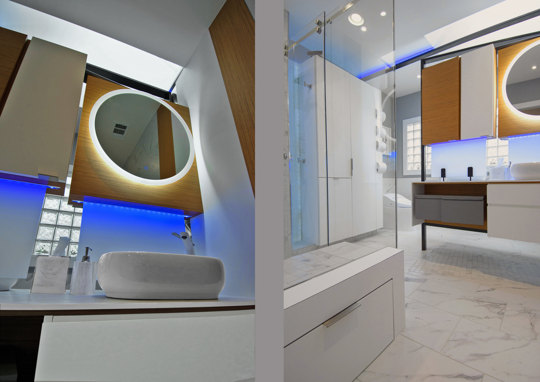 Custom modern bathroom remodel, Charlotte NCLuxury in a small space – double sided “him & her” custom island vanity in steel frame .