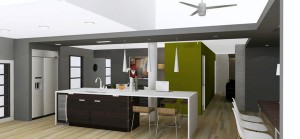 Midcentury Modern inspired custom kitchen with banquette and screen in walnut
