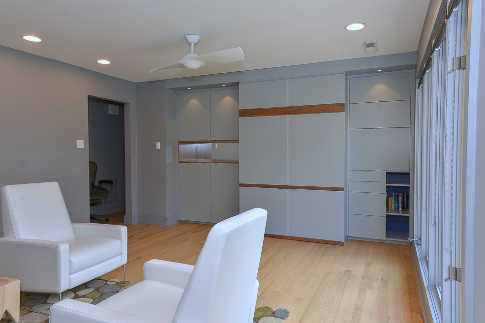 Midcentury Modern inspired custom kitchen with banquette and screen in walnut
